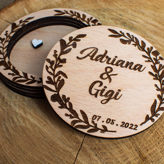 Cutie Verighete Rotunda Personalizata HH1633 din Lemn 10x10 cm