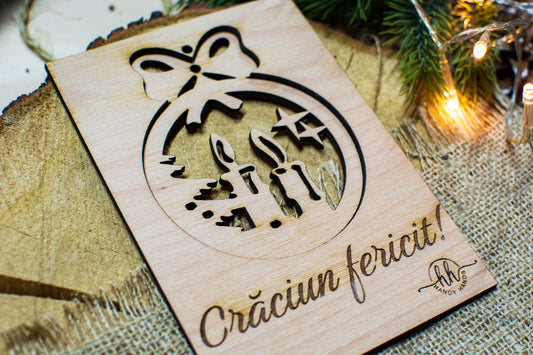 Felicitare cu Glob de Craciun din lemn HH865 Personalizata Craciun Fericit Model Lumanare