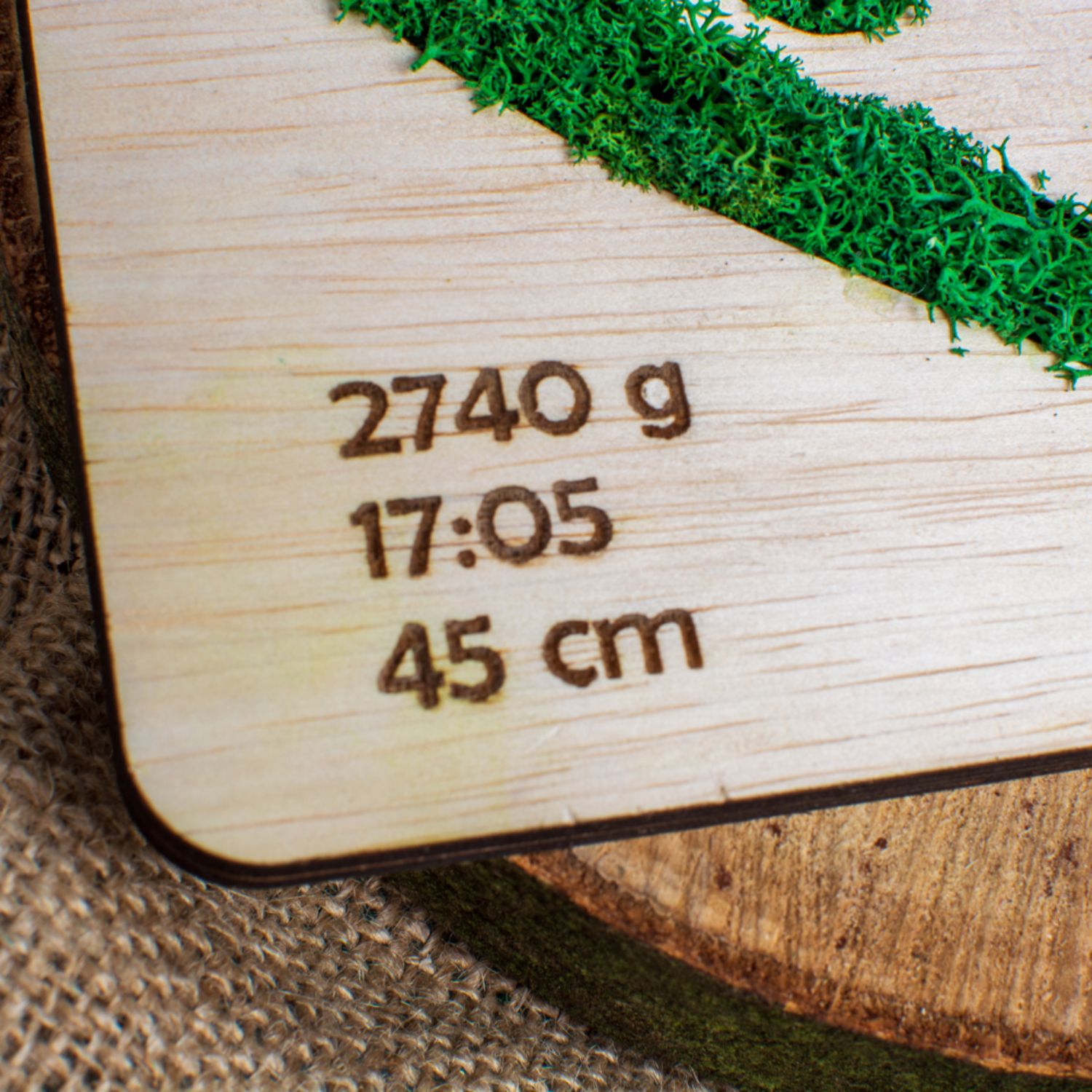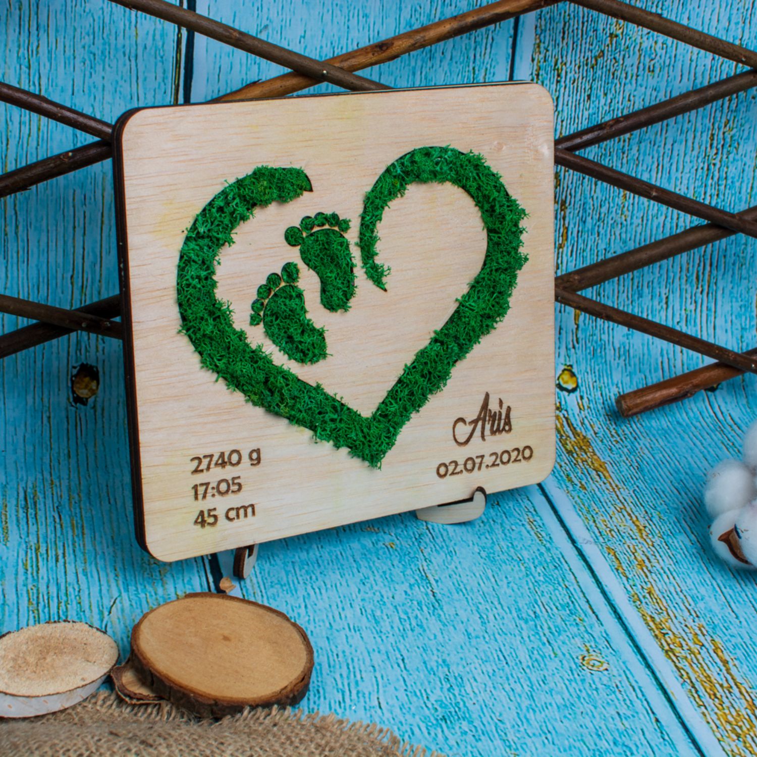 Rama Inima Personalizata cu Detaliile Nasterii HH1551 din lemn Personalizat cu Licheni 17x15 cm