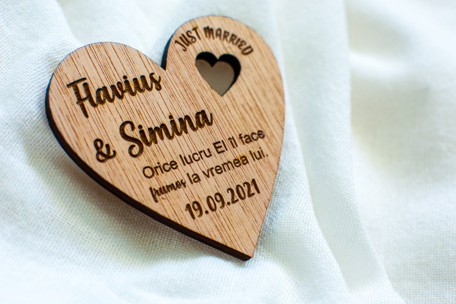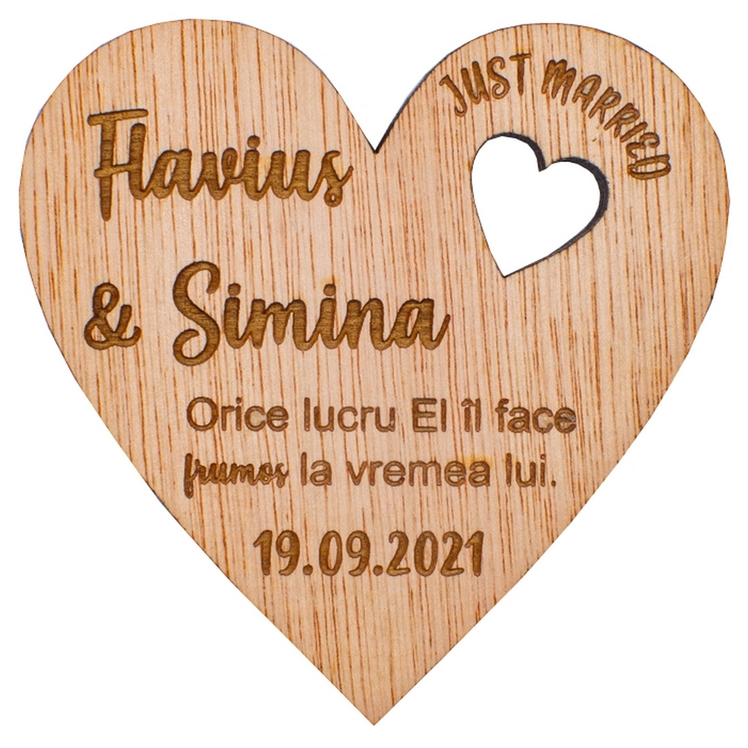 Set 10 bucati Marturie Aranjament HH6722 de masa Personalizata din lemn Nunta Just Married Proaspat Casatoriti Inima