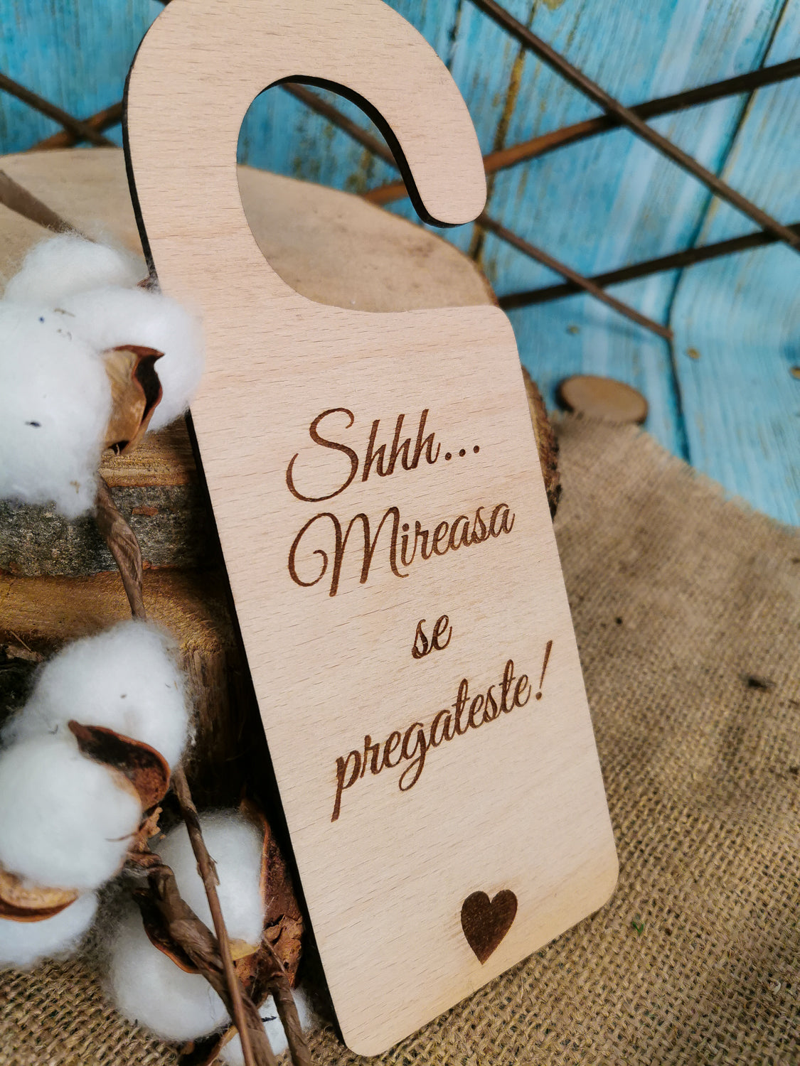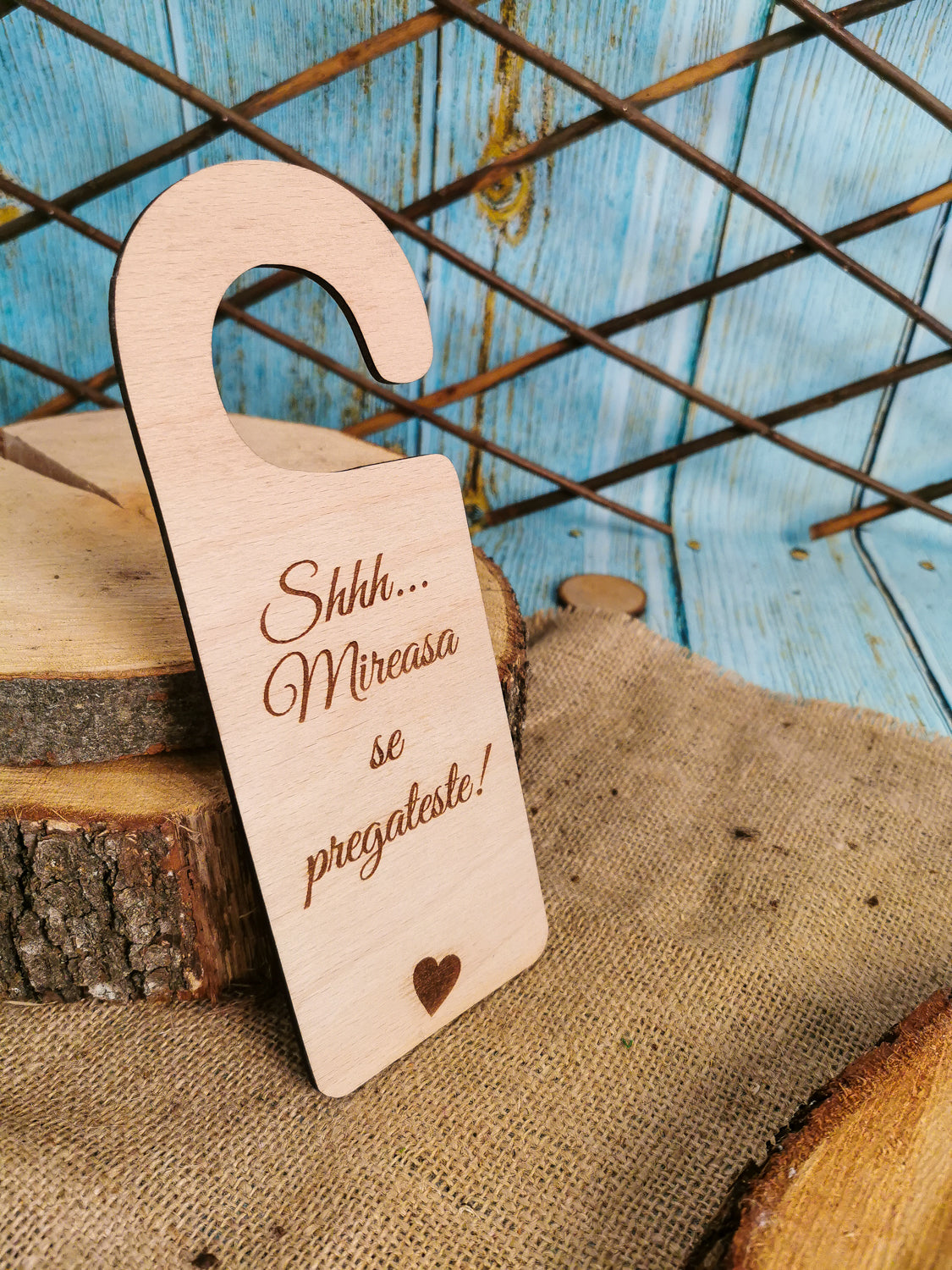 Set 2 Agatatoare HH1632 Decor Semn de Usa din lemn Personalizat Mire si Mireasa este un accesoriu elegant si rafinat, perfect pentru a adauga un plus de farmec camerei mirilor. Realizate din lemn de calitate, aceste agatatoare pot fi personalizate cu numele mirilor sau un mesaj special. Designul lor delicat si personalizarea le fac ideale pentru decorarea usii camerei in ziua nuntii sau pentru a fi folosite ca amintiri speciale. Setul este perfect pentru a adauga o nota romantica si unica in orice eveniment de acest tip.