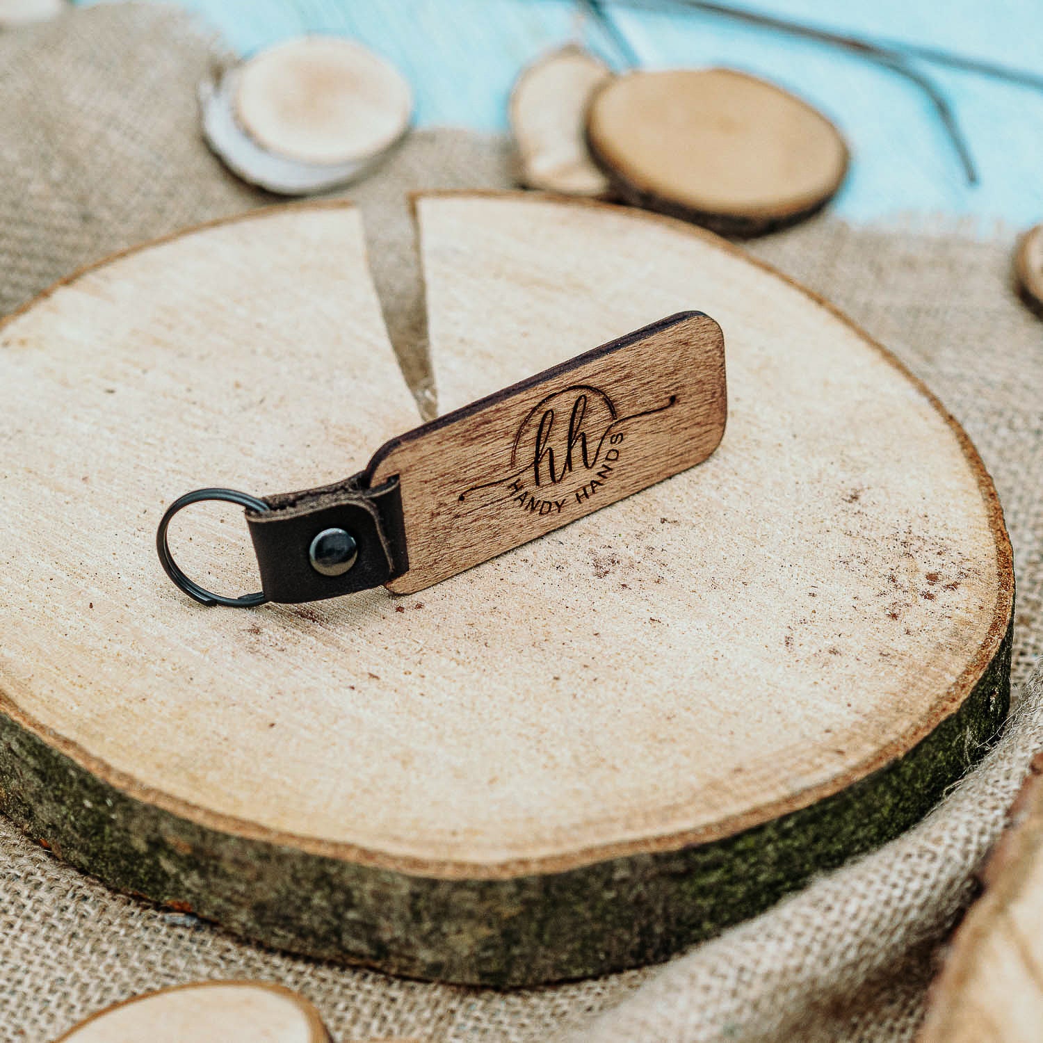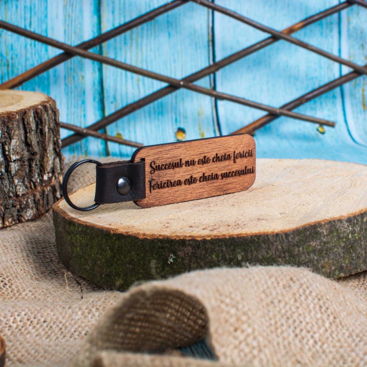 Set 5 bucati Breloc Premium din lemn HH9488 Personalizat Model Dreptunghiular cu prindere de Piele 8x3 cm