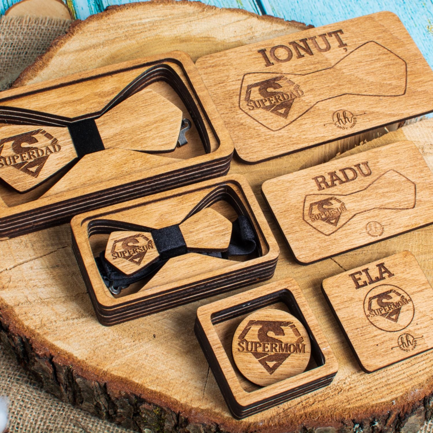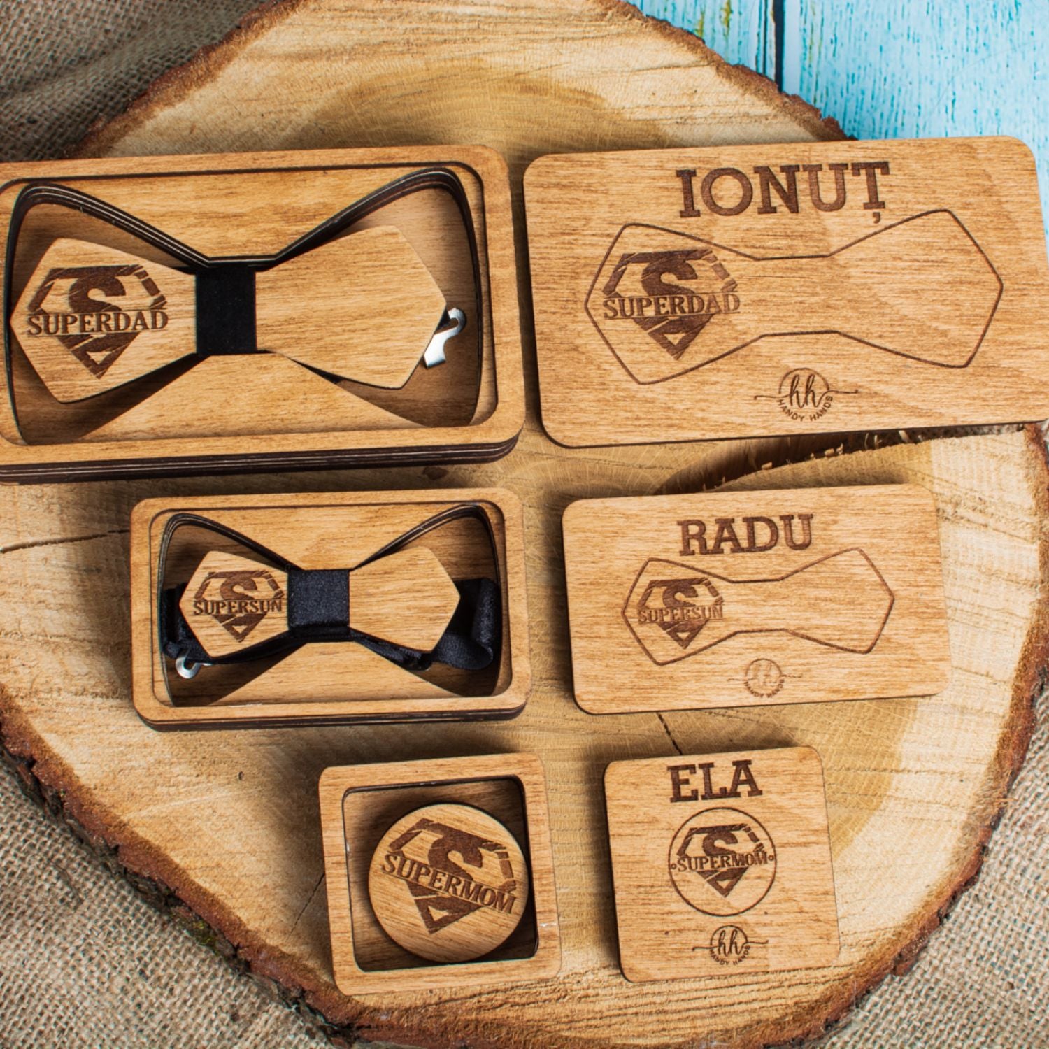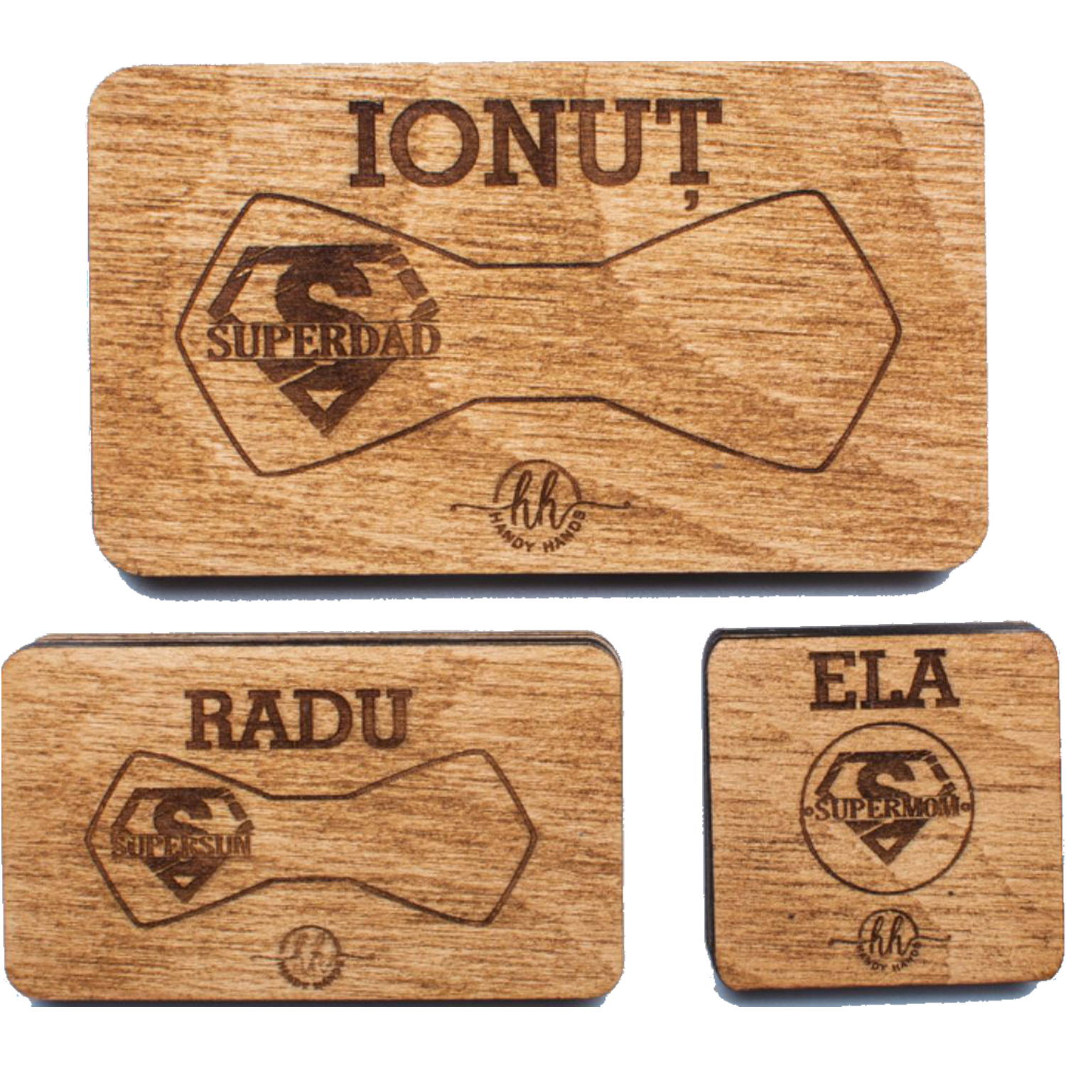 Pachetul este un cadou elegant si rafinat, perfect pentru orice ocazie speciala. Realizat din lemn de calitate, acest set contine papioane personalizate, ideale pentru a fi purtate de membrii familiei la evenimente importante sau pentru a oferi un cadou unic si memorabil. Fiecare papion poate fi personalizat cu nume sau detalii speciale. Setul vine intr-o cutie premium, care adauga un plus de eleganta si protectie. Un cadou perfect pentru familie, care va adauga un strop de stil si unicitate oricarui eveniment.