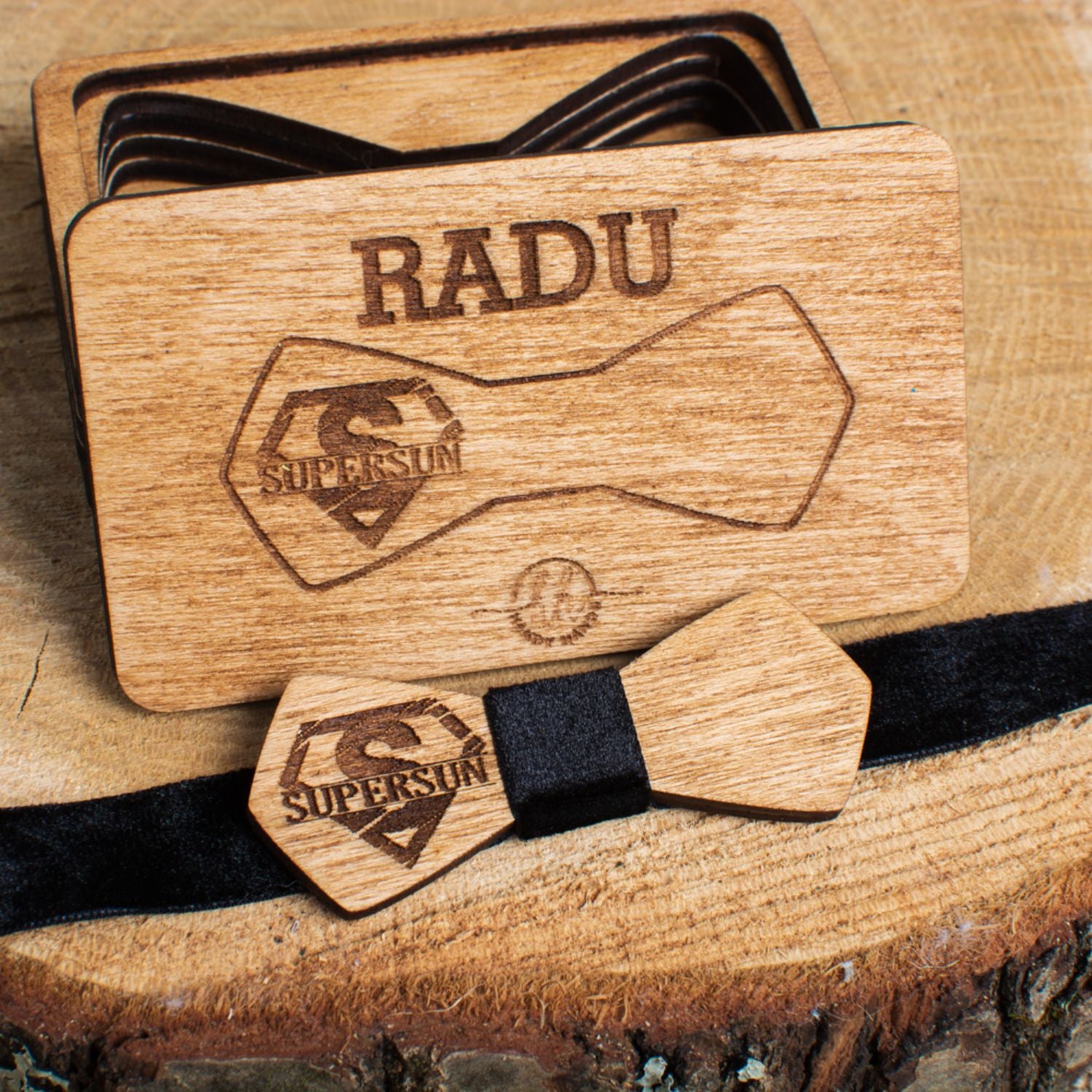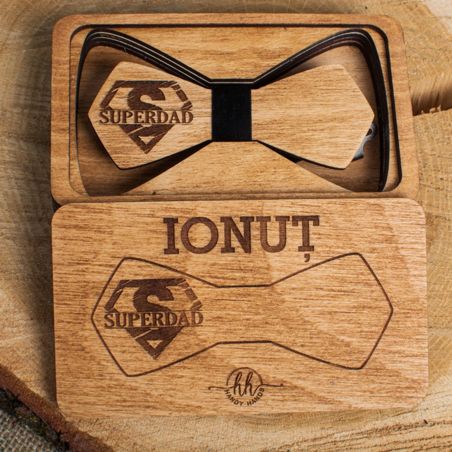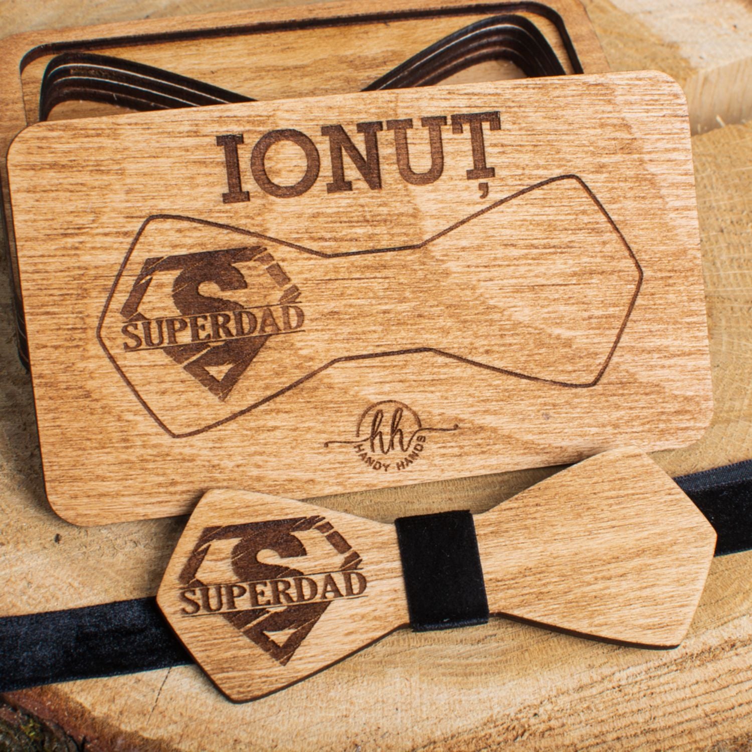 Pachetul este un cadou elegant si rafinat, perfect pentru orice ocazie speciala. Realizat din lemn de calitate, acest set contine papioane personalizate, ideale pentru a fi purtate de membrii familiei la evenimente importante sau pentru a oferi un cadou unic si memorabil. Fiecare papion poate fi personalizat cu nume sau detalii speciale. Setul vine intr-o cutie premium, care adauga un plus de eleganta si protectie. Un cadou perfect pentru familie, care va adauga un strop de stil si unicitate oricarui eveniment.